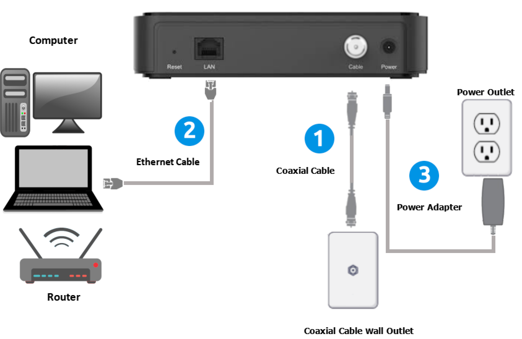 Connect to an Ethernet port on the back panel of the modem and connect to the other end to the Ethernet port of a PC or router (wireless access point). Use a Category 5e or Category 6 ethernet cable with RJ 45 connectors to ensure Gigabit Ethernet speeds (if the computer supports it).