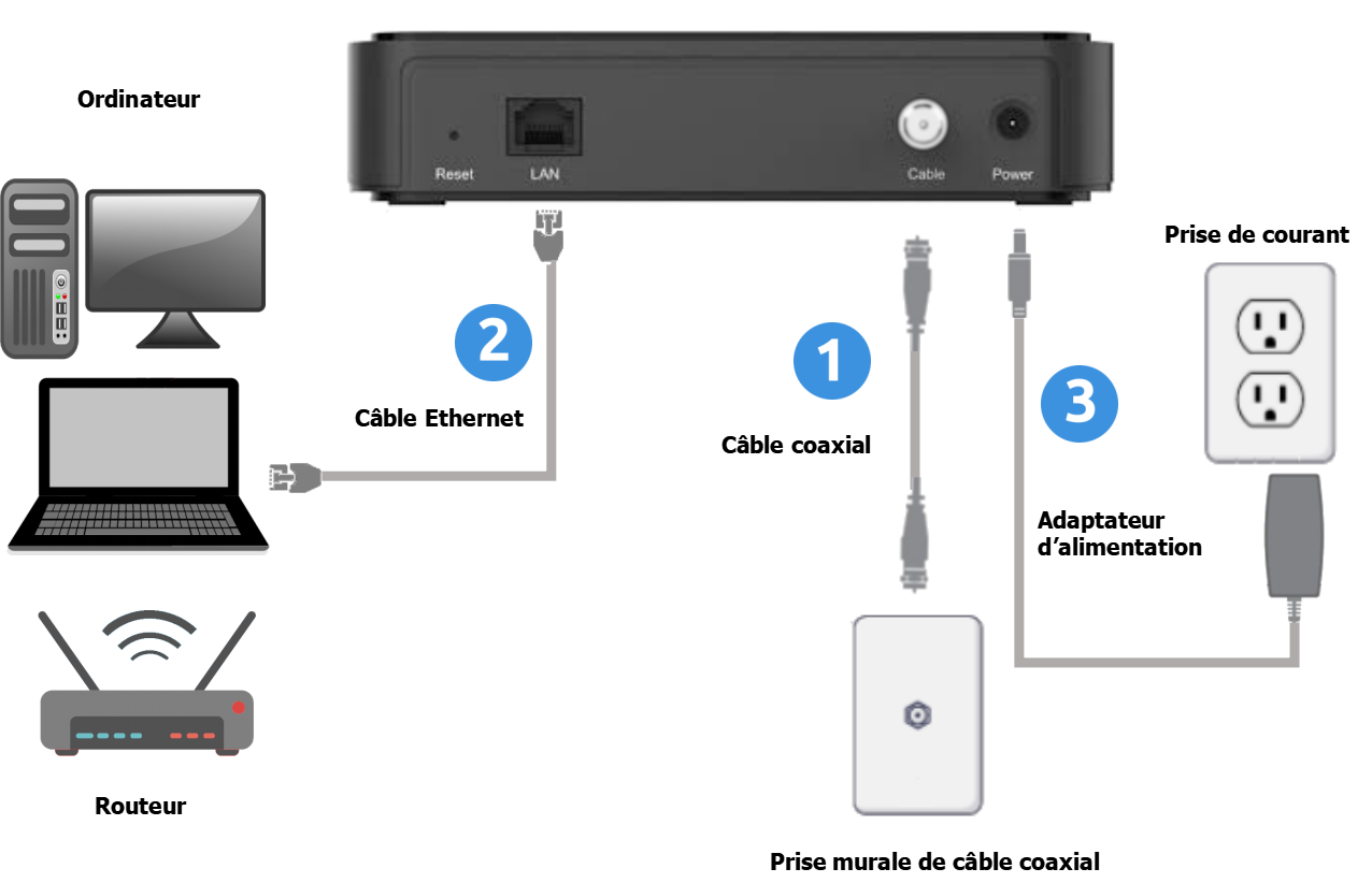 Connectez-le à un port Ethernet sur le panneau arrière du modem et connectez l'autre extrémité au port Ethernet d'un ordinateur ou d'un routeur (point d'accès sans fil). Utilisez un câble Ethernet de catégorie 5e ou de catégorie 6 avec des connecteurs RJ-45 pour garantir des vitesses Gigabit Ethernet (si l'ordinateur est compatible).